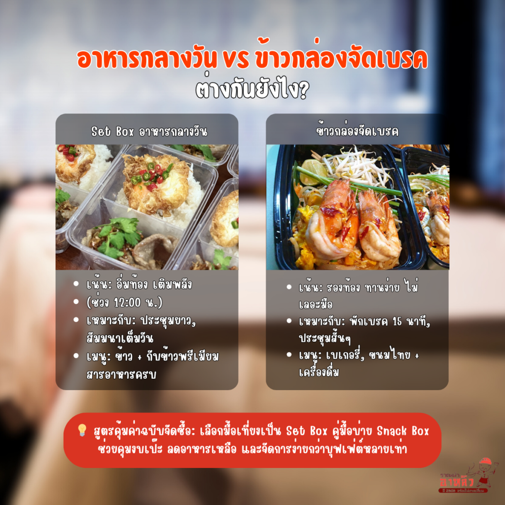 หากเป็นงานประชุมหรือสัมมนาเต็มวัน เทคนิคที่ฝ่ายจัดซื้อยุคใหม่นิยมใช้คือการเลือก Set Box เป็นมื้อเที่ยง และสลับมาใช้ Snack Box ในช่วงพักเบรคเช้า-บ่าย เพื่อความหลากหลายและช่วยบริหารจัดการงบประมาณได้อย่างมีประสิทธิภาพ แต่ถ้าเป็นงานประชุมสั้นๆ เพียง 1-2 ชั่วโมง การใช้แค่ข้าวกล่องจัดเบรคก็เพียงพอแล้วเพื่อเน้นความรวดเร็ว